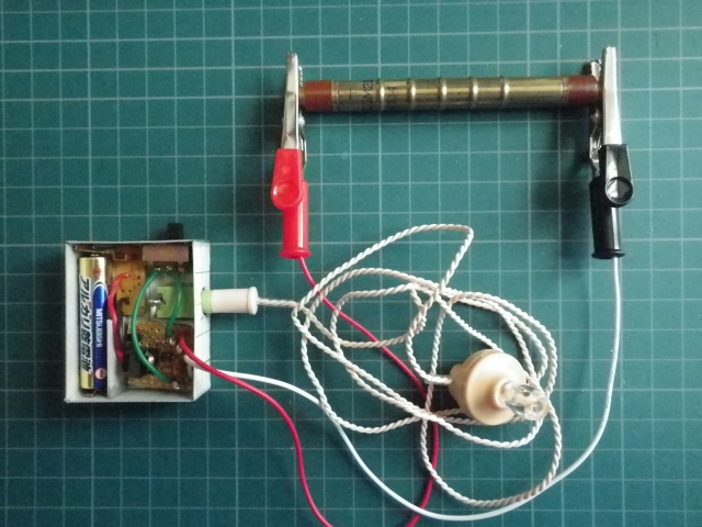 電源をONしてクリスタルイヤホンを耳に付けると、バックグラウンドの放射線を拾う